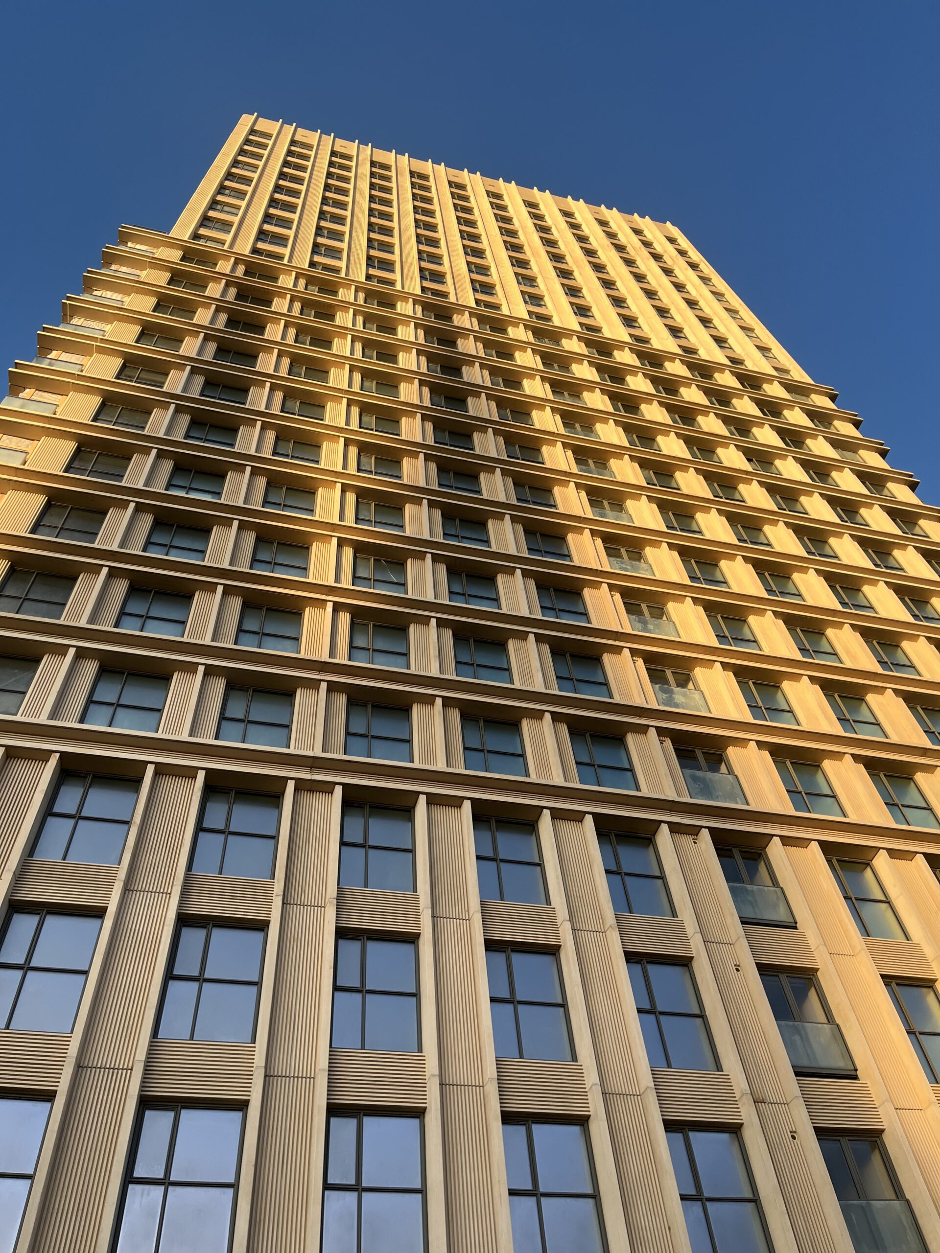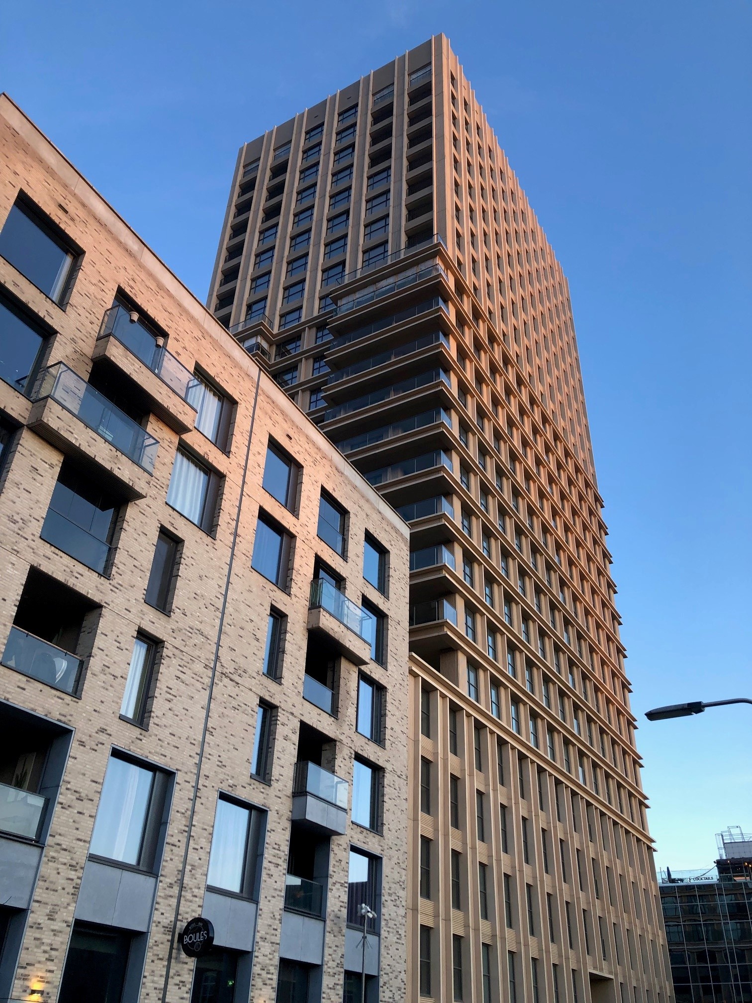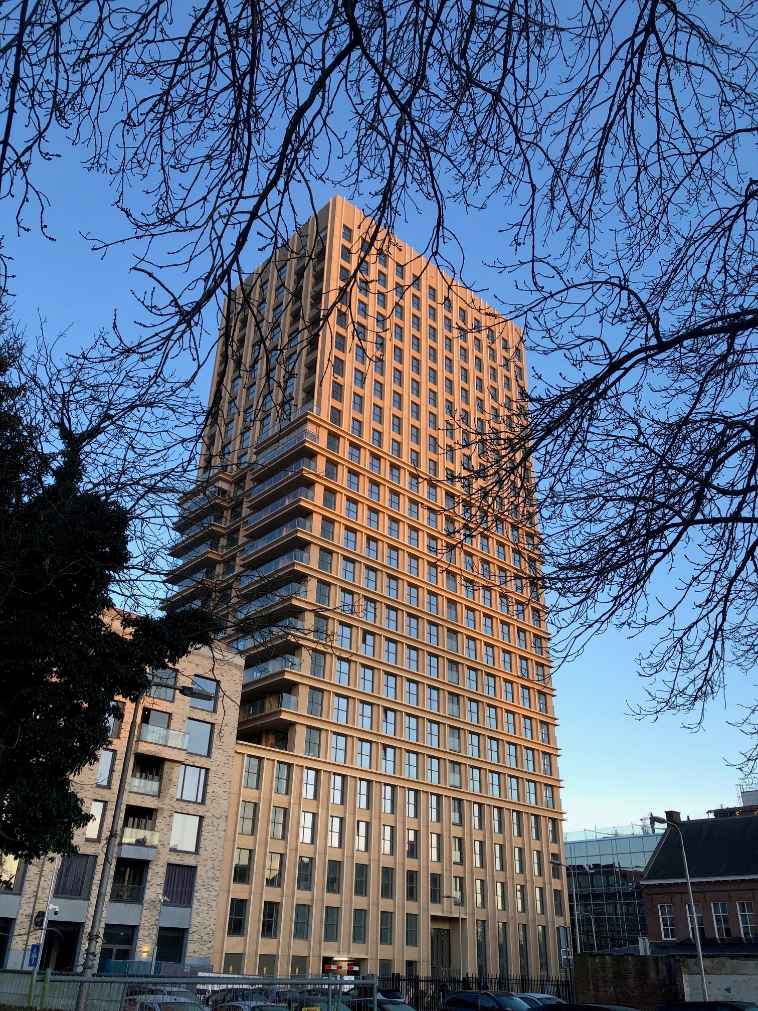 Vanwege het ontbreken van een echte bouwplaats zijn de aluminium kozijnen door ons gemonteerd in de prefab betonelementen, waarna deze op de bouwplaats werden opgestapeld, waardoor in een spectaculair bouwtempo een prachtige woontoren is verschenen.